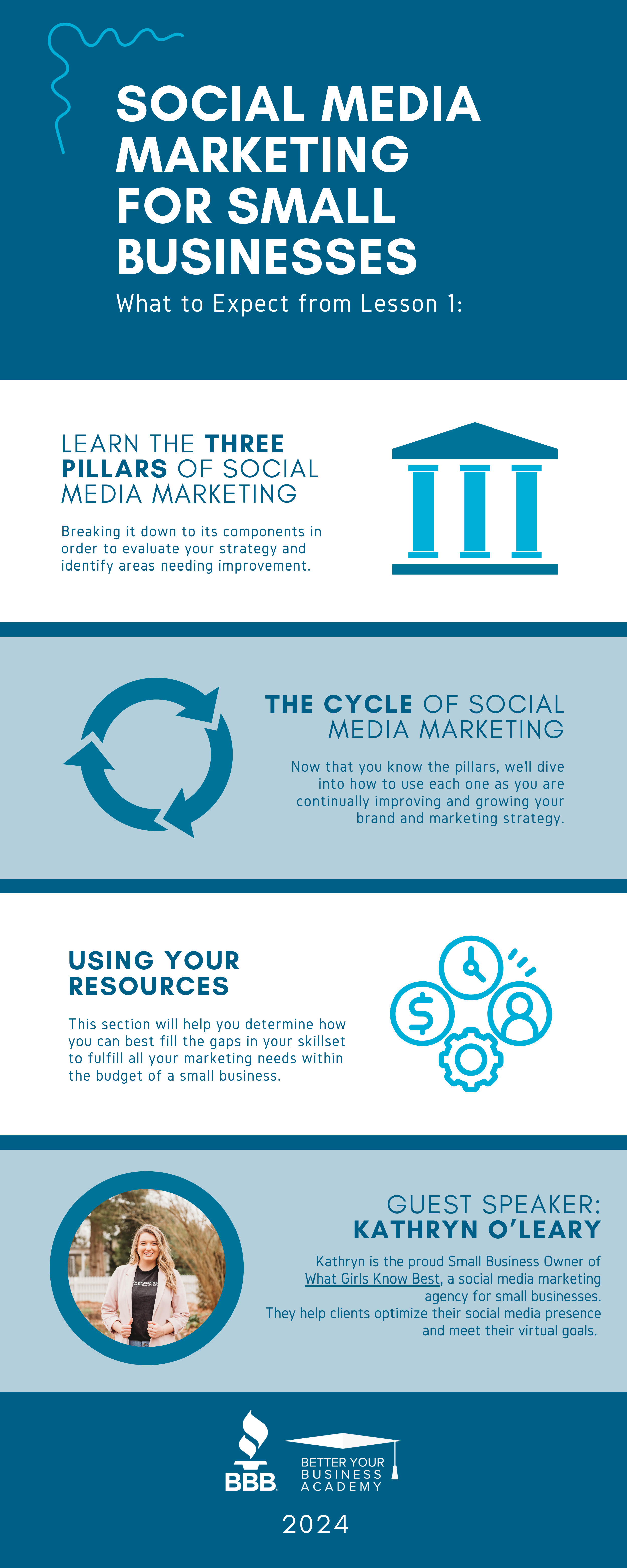 Kathryn O’Leary, owner of What Girls Know Best, a social media marketing agency for small businesses, is this lesson’s speaker. She’ll dive into choosing your content and platform mediums, tracking engagement, and how to use your currently available resources to best achieve your goals within your budget and constraints.