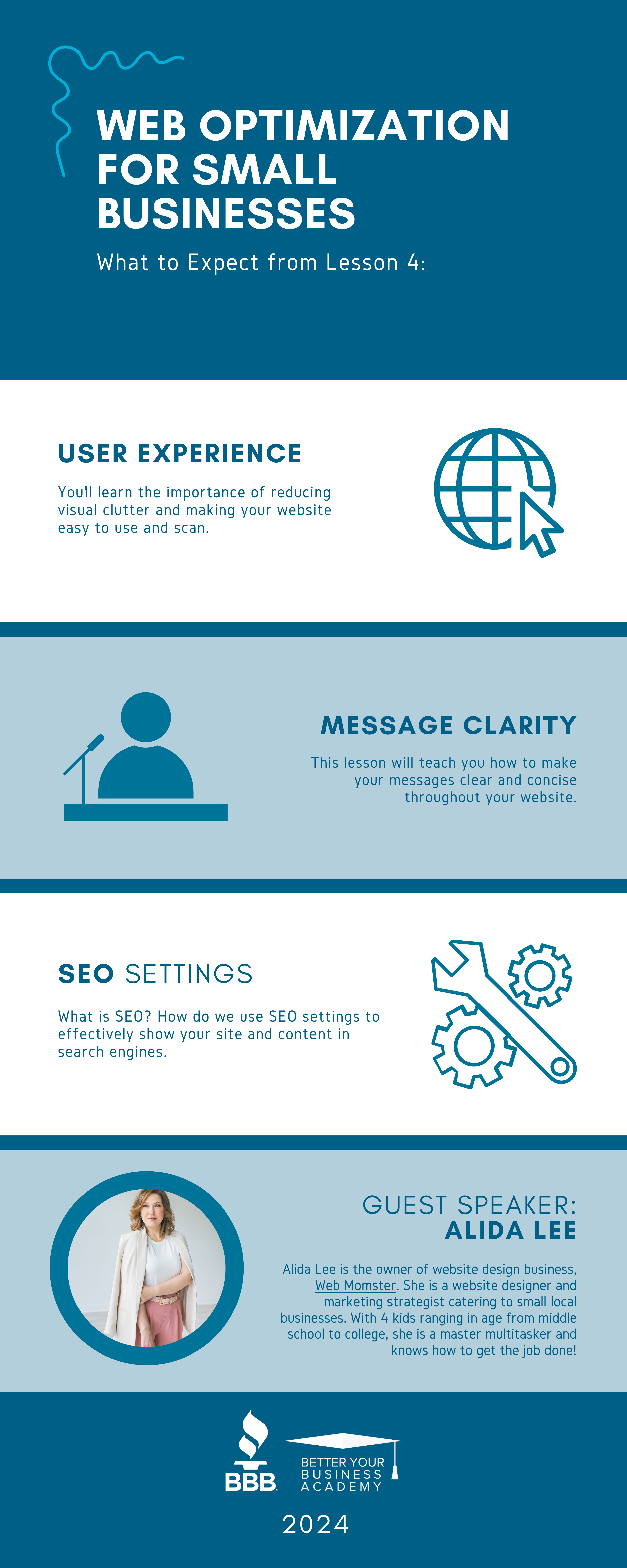 Lesson four is all about website design and using your website as a marketing tool. Our guest speaker for this section is Alida Lee of Web Momster. Alida puts the "mom" in Web Momster. She is a website designer and marketing strategist catering to small local businesses. With 4 kids ranging in age from middle school to college, she is a master multitasker and knows how to get the job done! Alida is the recipient of the 2024 Greenville Community Votes Platinum Award for Website Design and the Gold Award for Marketing.